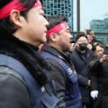 IBK기업은행 노조원들이 10일 서울 중구 IBK 기업은행 본점에서 장민영 기업은행장의 출근을 저지하고 있다. < IBK기업은행 노동조합 > 노조 간부 100여... 건 갑질 아닌가"라고 목소리를 높였다. 류 위원장은 "금융위가 체불된 기업은행 보상휴가를 분할지급하겠다고 하는데 이는 절대 수용할 수 없다"며...