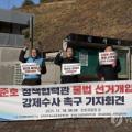 강원평화경제연구소와 전국교직원노동조합 강원지부, 정의당 강원도당, 춘천공동행동, 춘천시민연대가 18일 오전 강원 춘천시 강원경찰청 앞에서 기자회견을 열고 최준호 강원교육청 정책협력관이 폭로한 '교직원 선거 개입' 의혹 사건과 관련한 강제수사를 촉구하고 있다. 2025.11.18