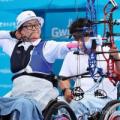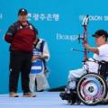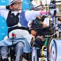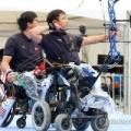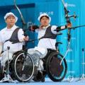 28일 광주 동구 5·18민주광장 특설경기장에서 열린 2025 세계장애인양궁선수권대회 W1(중증장애) 남자 복식 결승전에서 금메달을 딴 중국선수들이 활시위를 당기고 있다. 2025.9.28