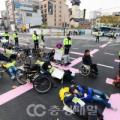 충북지역 공공교통확대를 위해 충북기후위기비상행동 등 4개 단체로 구성된 '충북모두의공공교통(준)이 24일 충북 청주시 상당구 상당사거리에서 저상버스 확대, 공공마을버스 도입, 안전한 보행로 정비 등을 촉구하며 '다이인(죽은 것처럼 드러눕는 시위) 퍼포먼스를 하고 있다.