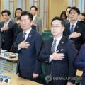 더불어민주당 정청래 대표가 9일 국회의원회관에서 민주당 '윤석열 정권 조작기소 진상규명 및 공소취소를 위한 국정조사 추진위원회'가 연 검찰의 공소권 남용·공소취소 제도 관련 정책토론회에 참석해 추진위 위원장인 한병도 원내대표, 부위원장인 박성준 의원 등 참석자와 국기에 경례하고 있다. 2026.3.9