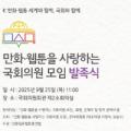 국회와 만화웹툰협회총연합(만총연·회장 서범강)은 오는 25일 오전 11시 국회의원회관 제2소회의실에서 '만화·웹툰을 사랑하는 국회의원 모임' 발족식을 개최한다고 16일 밝혔다. 이번 모임은 더불어민주당 서영석 의원과 국민의힘 김승수 의원이 주도해 꾸려졌으며, 만화·웹툰 산업 발전을 위한 초당적 협력...