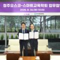 청주오스코사업단(단장 김성현·왼쪽)과 사단법인 스마트교육학회(학회장 박종필)가 지난 26일 '2025 충북에듀테크 콘펙스'의 성공적 개최를 위한 업무협약을 했다. 충북에듀테크 콘펙스는 충북도를 대표하는 교육·에듀테크 전문 콘퍼런스·전시회다. 청주시 제공
