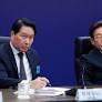이재명 대통령과 최태원 SK그룹 회장이 2025년 6월 울산 울주군 울산전시컨벤션센터에서 열린 'AI 글로벌 협력 기업 간담회'에서 참석자의 발언을 듣고 있다.