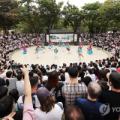 (용인=연합뉴스) 홍기원 기자 = 추석 연휴 마지막 날이자 한글날인 9일 경기도 용인시 한국민속촌을 찾은 시민들이 '삼도판굿' 공연을 관람하고 ...