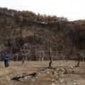 지난해 4월 경북 안동시 길안면 현하리 산불 피해 사과 농장에서 한 농장주가 불에 타 바짝 마른 사과 나무를 살펴보고 있다. [사진제공=뉴시스] "밤이... "_안동 산불 피해 주민 A씨 18일 그린피스 동아시아 서울사무소와 녹색전환연구소, 재난피해자권리센터 '우리함께'가 영남 초대형 산불 피해 주민을...