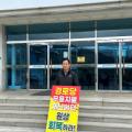 울산 울주군 중대노인당 김포경 총무가 웅촌면 행정복지센터 앞에서 1인 시위를 하고 있다. 오상민 기자 지난해 여름 폭염 속 경로당...