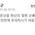 이투데이=기정아 기자 | 안전재난문자 발송 26일 오전 6시 33분께 울산 울주군 온산읍 화산리 일원에서 산불이 발생했다. 울주군은 이날 오전 7시 15분께 안전재난문자를 통해 “온산읍 화산리 일원 산불 발생으로 연기가 확산되고 있다”며 “인근 주민과 차량 운행자는 연기 흡입 및 안전사고에 유의해...