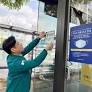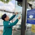 오병권 행정안전부 자연재난실장이 7일 대전시 대덕구를 찾아 무더위 스마트쉼터 현장점검을 하면서 직접 스티커를 붙이고 있다. 행정안전부 제공. 김윤림 기자.