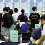 지난달 16일 오후 경북 구미시 복합스포츠센터에서 열린 '춘하추동 취업 한마당'에서 구직자들이 회사별 채용정보를 살펴보고 있다. 연합뉴스.