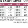 23일 한국부동산원에 따르면 최근 3개월간(9~11월) 서울의 주택가격 상승률은 2.8%로 소비자물가 상승률(0.5%)의 1.5배인 0.75%를 크게 웃돌았다.... 특히 중구(1.82%→3.83%), 동작구(2.23%→4.43%), 강동구(2.57%→4.79%) 등은 2%포인트가량 상승 폭이 커졌다. 같은 기간 상승 폭이 작아진 곳은 중랑, 강북, 도봉, 노원...