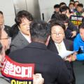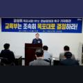 ▲ 전남 서남권 지방의원들이 18일 오후 전남도의회에서 강기정 전남광주통합특별시장 예비후보의 사퇴와 국립의대 발언에 대해 항의를 하고 있다. [독자 제공] 강 예비후보는 지난 16일 순천시의회에서 '동부권 100만 도시를 위한 10가지 약속'을 발표하며 "순천에 의대와 부속대학병원을 설립하겠다"고 밝혀...