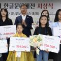 9일 오전 대구 동구 영남일보 지하 대강당에서 열린 '제4회 한글문예대전 시상식'에서 대상 수상자들이 기념촬영을 하고 있다. 이윤호기자 yoonhohi@yeongnam.... 서예부문 대상은 한은영씨(성인부·경기 고양시)를 비롯해 정아율(초등1부·창원 어깨동무학교 3년), 오하음(초등2부·대구 수성초 6년) 학생에게...