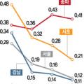 강북권에서도 용산구가 0.24%에서 0.17%로 상승폭이 줄었고, 성동구(0.37%→0.22%)에서도 비슷한 흐름이 포착됐다. 일례로 서울 서초구 서초동 ‘서초센트럴아이파트’ 전용 80㎡는 지난 2일 18억7000만원에 거래되며 지난달 28일 최고가(20억원) 대비 1억3000만원이 하락했다. 용산구 이촌동 ‘강촌’ 전용...