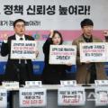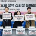 4일 오전 서울 종로구 경제정의실천시민연합에서 열린 22대 국회의원 부동산재산 분석결과 발표 기자회견에서 참석자들이 정부의 실질적인 집값거품 제거 정책을 촉구하며 구호를 외치고 있다. 이날 분석결과 발표에 따르면 국회의원 신고 부동산 재산평균은 19.5억으로 국민 평균 4.2억의 4....