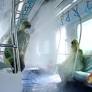 3일 인천 남동구 인천교통공사 운연차량사업소에서 실시된 '무인 전동차 화재진압 시연'에서 전동차 천장에 설치된 미분무소화설비(물을 미세한 입자로 분무하는 화재진압 장치)를 이용 화재진압액이 분사되고 있다. 인천교통공사는 국내 최초로 전동차 내 미분무소화설비 화재진압 시스템을 도입해...