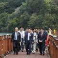 이장우 대전시장(왼쪽 두번째)과 서철모 서구청장(왼쪽 세번째)이 21일 '장태산 물빛거닐길'을 걷고 있다. [사진=대전 서구] 2025.10.21 nn0416@newspim.com 올해 가을 개장을 목표로 1년여 간 공사 끝에 마무리돼 장태산의 울창한 메타세쿼이아 숲과 장안저수지의 고요한 수면이 어우러진 새로운 수변 명소로...