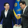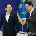 대한민국시도지사협의회장 유정복 인천광역시장(왼쪽)과 박형준 부산광역시장이 1일 서울 용산 대통령실 청사에서 열린 전국 시도지사 간담회 시작에 앞서 논의하고 있다. 2025.8.1