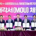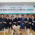 포항 영일대 주차장 부지 개발 협약 체결 포항 이어 청주 오송서도 도시개발사업 추진. 김승석 대표(왼쪽 5번째)와 이강덕 포항시장(왼쪽 4번째), 콘소시엄 관계자들이...