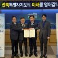 국비 238억원 확보 새만금 수질 개선 ‘파란불’ 전북도·전주시·완주군 지방비 102억원 분담 정성주 김제시장이 지난해 5월 전북특별자치도와 전주시, 완주군과 혁신도시 악취저감 업무협약을 체결하고 기념촬영을 하고 있다. 김제시 제공 새만금유역 수질 개선과 가축 분뇨 등으로 인한 혁신도시 악취...