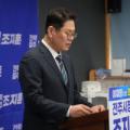 더불어민주당 조지훈 전북 전주시장 예비후보가 11일 전주시청에서 연 기자회견에서 "우범기 시장은 시장 직위를 활용하고 권한을 남용하는 조직적 선거운동을 중단하라"면서 우 시장을 직격하고 있다. 2026.3.11