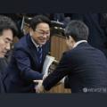 강기정 광주광역시장이 9일 오전 서울 여의도 국회 행정안전위원회에서 열린 행정구역 통합 관련 제정법률안에 대한 입법공청회에 참석하며 윤건영 더불어민주당 의원과 인사하고 있다. 2026.02.09 pangbin@newspim.com