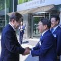 강기정 광주광역시장이 26일 오후 하남혁신지원센터에서 열린 '민주노총 광주본부 사무실 개소식'에 참석해 이종욱 본부장과 인사를 나누고 있다.