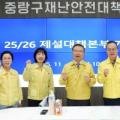 류경기 중랑구청장을 포함한 다섯 명이 주먹을 쥐고 들어 올리는 포즈를 취하고 있는 사진이다. 배경에는 ‘중랑구 재난안전대책본부’라는 문구와 ‘25/26 제설대책본부 개소식’ 문구가 적혀 있다. [헤럴드경제=박종일 선임기자]중랑구(구청장 류경기)가 2025년도 행정안전부 주관 ‘자연재해 안전도...