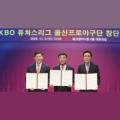 허구연 KBO 총재와 김두겸 울산광역시장, 김철욱 울산시체육회장(왼쪽부터)이 11월 5일 오후 1시 30분 울산광역시청 2층 대회의실에서 KBO 퓨처스리그 울산프로야구단...