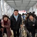 오승록 노원구청장이 육교 계단을 오르며 환하게 웃고 있고, 양 옆에는 미소 짓는 주민들이 함께하고 있는 사진이다.육교에는 캐노피가 설치되어 있으며, 배경에는 눈이 쌓인 풍경이 보인다. 오승록 노원구청장은 12일 오후 4시 월계미성미륭삼호아파트 단지 내 주차장에서 열린 ‘광운대역 육교 리모델링 공사...