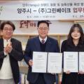 ▲ 강수현 양주시장(왼쪽 두번째)과 기은서 그린베이크 대표가 지역 농특산물과 도시브랜드를 활용한 업무협약을 체결한 뒤 기념사진을 찍고 있다. 왼쪽부터 기덕현 그린베이크 회장, 기은서 대표, 진 주무관. 양주시 공무원 '진 주무관'의 얼굴이 지역 샌드위치 포장지에 등장한다. 전국에서도 보기 드문...