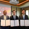 니틴 압테 뷔나 그룹 회장과 김태흠 충청남도지사, 가세로 태안군수(왼쪽부터)가 6일 싱가포르 스위소텔 더 스탬포드 호텔에서 투자 양해각서(MoU) 체결 기념 촬영을 하고 있다. 아시아 태평양 지역 에너지·디지털 인프라 전환 기업 뷔나 그룹이 충청남도, 태안군과 손잡고 대규모 재생에너지 투자에 나선다....