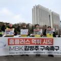 민주노총 마트산업 노동조합 홈플러스지부 조합원들이 지난 1월 12일 오전 서울 서초구 서울중앙지법 앞에서 기자회견을 열고 김병주 MBK파트너스... 홈플러스 청산은 단순한 기업 폐업이 아니라 지역 일자리 붕괴이자 지역 경제의 연쇄 파탄"이라고 경고했다. 이코노미퀸 | 사진 뉴스1