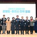 '기후위기 대응을 위한 강원도·춘천시 전략 포럼'이 18일 강원대 글로벌경영관에서 배숙경 춘천시의회 부의장, 임미선 강원도의원, 권희영·남숙희 춘천시의원, 이득찬 강원대 산학연구부총장, 경민현 강원도민일보 사장 등이 참석한 가운데 열렸다. 강원도와 춘천시, 강원대 KNU지속가능미래융합연구원...