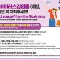 사진=니파바이러스감염증 감염예방수칙 포스터 매일일보 = 김기정 기자 | 전남 화순군은 니파바이러스감염증이 제1급 법정감염병 및 검역감염병으로... 특히 치명률이 40~75%로 매우 높고, 예방백신과 치료약이 없어 증상에 따른 대증치료를 해야하며 조기 발견과 격리가 필수이다. 이에 질병관리청은 최근...