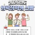 양구군청 전경 강원특별자치도 양구군(군수 서흥원)은 지역 학생의 학업 안정과 우수한 지역 인재 양성을 위해 2026년 양록 장학생을 선발한다고 밝혔다. 양구군은 지역의 인재 유출 방지와 학부모 가계 부담을 줄이고자 매년 양록장학생을 선발해 지원하고 있으며, 대학생에게 지급되는 장학금은 생활비...