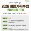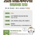 2026 마을계획수립 희망마을 모집 포스터 충남 청양군이 주민 주도의 마을 미래 설계를 본격화한다. 군은 마을의 중·장기 발전 방향과 고유한 비전을 주민 스스로 수립하는 마을만들기사업 1단계 '마을계획수립'에 참여할 희망마을을 오는 14일까지 모집한다고 밝혔다. '마을계획수립'은 주민이 주도해 마을의 중...