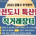서울 강동구(구청장 이수희)는 추석을 맞아 9월30일과 10월1일 이틀간 강동구청 열린뜰에서 ‘친선도시 특산물 직거래장터’를 개최한다. 이번 행사는 구가 전국 지자체와 맺은 교류 협력을 바탕으로 지역 농가의 판로 확대와 도농 상생을 도모하기 위해 마련됐다. 올해 새롭게 친선결연을 맺은 강원도...