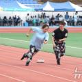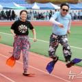 19일 오전 대구 달성군 현풍읍 달성종합스포츠파크에서 열린 '대구사회복지종사자 복지큰마당' 행사 중 미션 계주에 출전한 선수들이 일바지(고무줄 통바지)와 오리발을 착용한 채 결승선을 향해 달리고 있다. 이날 행사에는 군위군을 포함한 대구시 9개 구·군 사회복지사업 종사자 1000여 명이 참석했다....