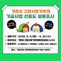 경남 거창군은 2026년 고향 사랑 기금사업 선정을 위해 군민의 의견을 반영하고자 오는 20일까지 고향 사랑 기금사업 선호도 설문조사를 실시한다. 이번... 군은 고향 사랑 기금을 활용하기 위한 사업으로 ▲종합사회복지센터 노후 기자재 교체 사업 ▲거창 형 야간 약국 지원사업 ▲영유아 성장지원 프로그램...