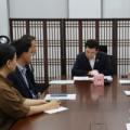 사진 설명 - 윤병태 나주시장(오른쪽)과 신정훈 국회의원(가운데)이 김민석 국무총리(왼쪽)에게 지역 현안을 설명하며 국비 지원을 요청하고 있다.