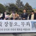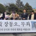 해남군 광주지법 해남지원 형사법정 앞에서 고 장씨의 사후 재심 무죄 선고 직후 소감을 밝히고 있다. 고 장씨는 2003년 7월9일 밤 8시39분쯤 전남 진도군 당시 명금저수지(현 송정저수지)로 몰던 화물차를 고의 추락하는 사고를 내 조수석에 탄 아내(당시 45세)를 살해한 혐의로 무기징역이 확정돼 복역 중 사망했...