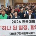 ▲ 박희조 대전 동구청장과 오관영 동구의회 의장, 동구장애인체육회 선수단과 관계자들이 23일 동구청 대회의실에서 열린 '2026 전국대회 출정식'에서... 론볼 선수단은 9월 29일 인천시장배 전국대회에 출전하며, 게이트볼은 10월 23일 금산인삼배 전국대회, 파크골프는 10월 31일 중앙회장배 전국대회에서...